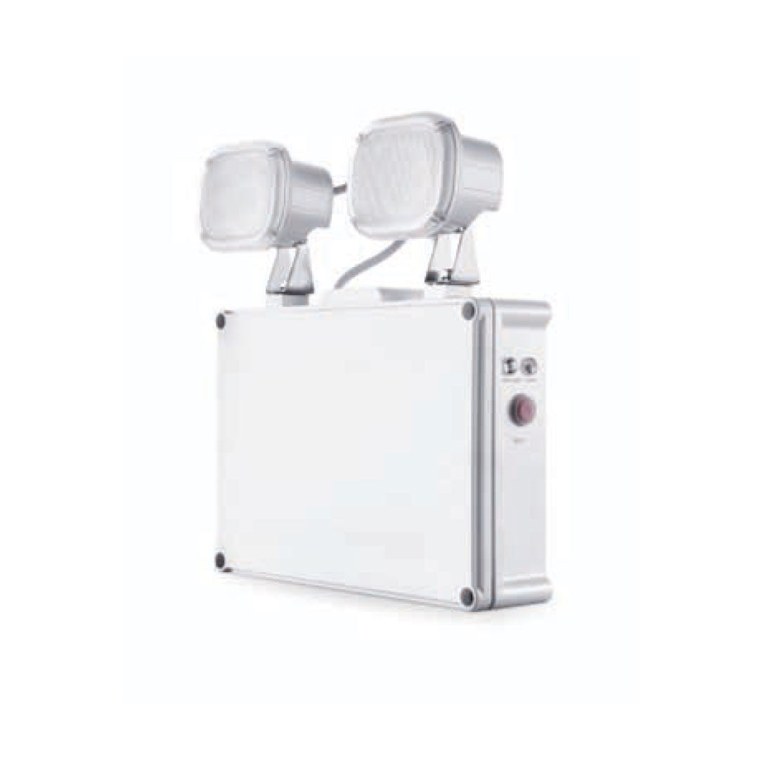 The LED exit spotlight is a standalone, twin-spot, maintenance-free emergency luminaire appropriate for egress route and anti-panic emergency illumination in factories, warehouses, and a variety of open environments where traditional integral emergency solutions are inappropriate.