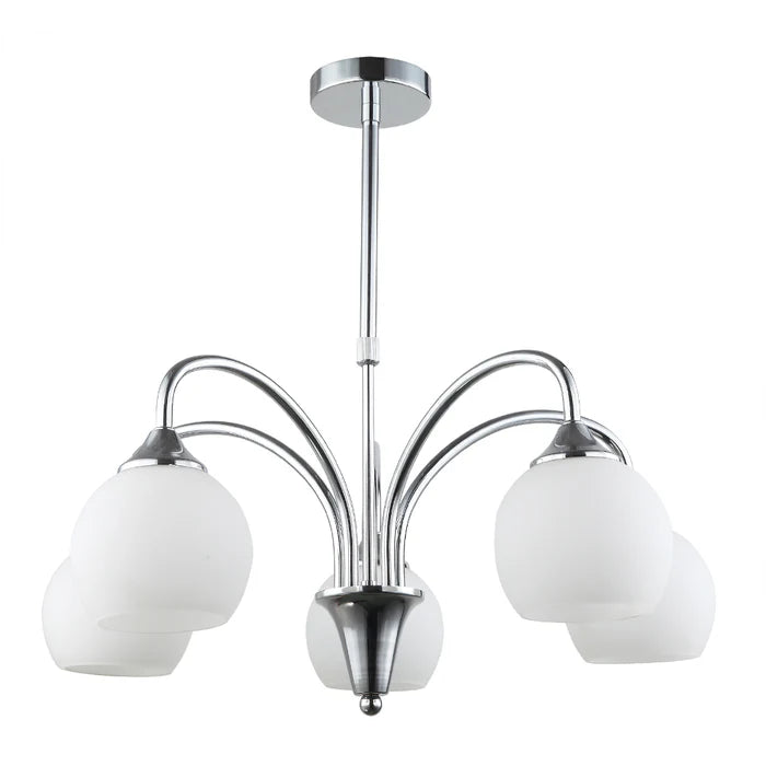 Enhance your space with a touch of elegance using this beautifully designed 5-light pendant lamp in silver and white. Its gently curved iron arms extend from a sleek silver mount, supporting five soft frosted glass shades that offer warm, ambient light.