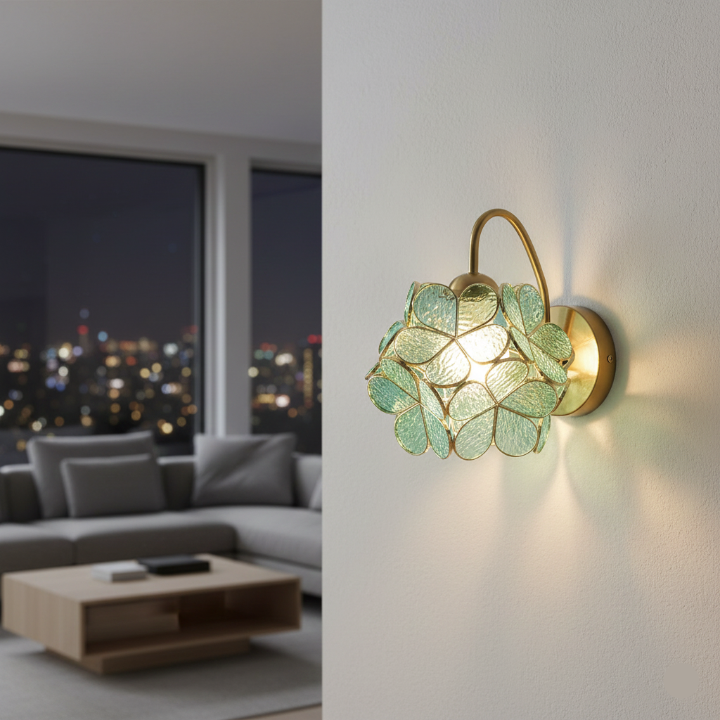 Bring elegance and charm to your interior spaces with the Blossom Luxe Wall Light. Inspired by nature, this stunning fixture features a handcrafted floral design with textured aqua glass petals framed in luxurious gold. The soft, diffused light creates a warm and inviting ambiance perfect for bedrooms, hallways, lounges, or feature walls.