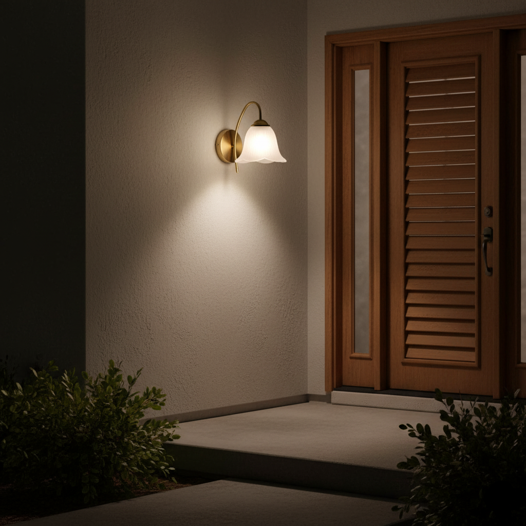 The Vintage Tulip-Flare Frosted Wall Lamp showcases a beautifully flared tulip-style frosted glass shade with a soft, scalloped edge that brings a touch of vintage elegance to your interior spaces. Its classic bell-shaped silhouette is paired with a gracefully curved golden arm, making it a versatile fixture for traditional, rustic, or contemporary decor themes. The frosted glass softens harsh lighting and emits a warm, ambient glow, perfect for creating a cozy atmosphere. Built for durability and broad voltage compatibility, it is ideal for use in residential and hospitality environments. With its timeless appeal and practical illumination, this wall lamp elevates both style and function.