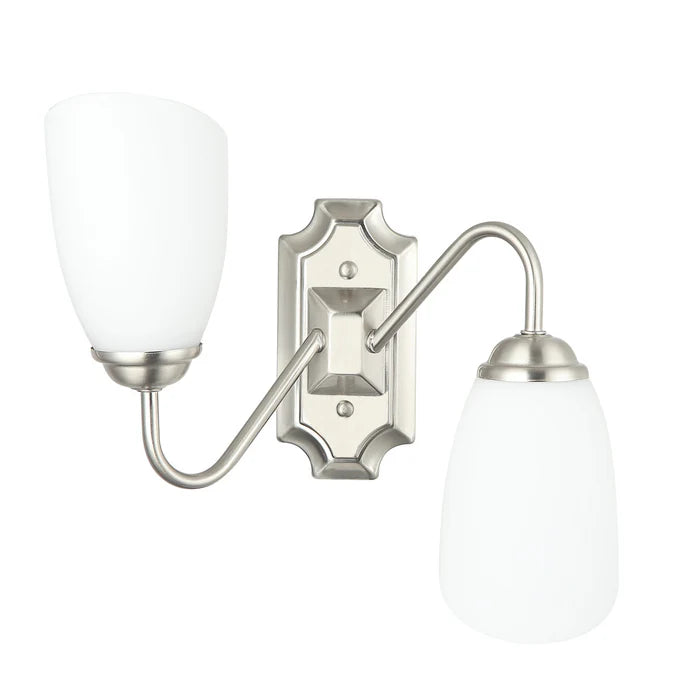 levate your interior décor with this elegantly designed double-arm wall light. Its timeless silver finish beautifully complements the sleek white glass shades, offering a sophisticated yet understated charm. The fixture blends modern aesthetics with classic elements, making it an ideal addition to any home or commercial space. Perfect for enhancing ambient lighting, it combines style and functionality effortlessly.